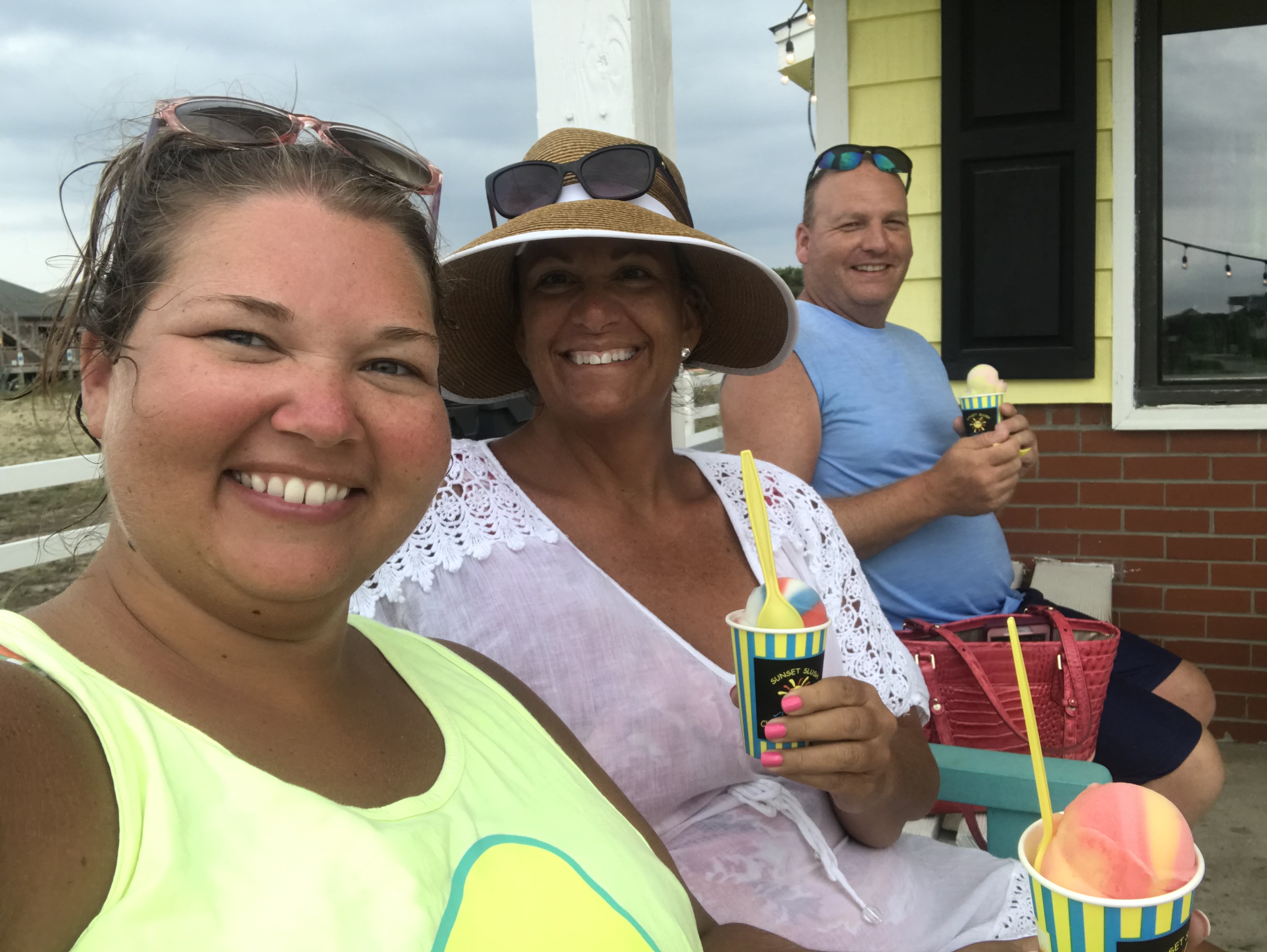 Once Glenn fished a bit and we tanned and got caught up with each other we left the beach and had some Italian ice. Right beside the public access parking lot are two buildings: one for ice cream and one for Italian ice. We opted for the latter at Sunset Slush of Holden Beach. It was delicious. They will swirl together any flavors. (We went there both days I visited 🤗)