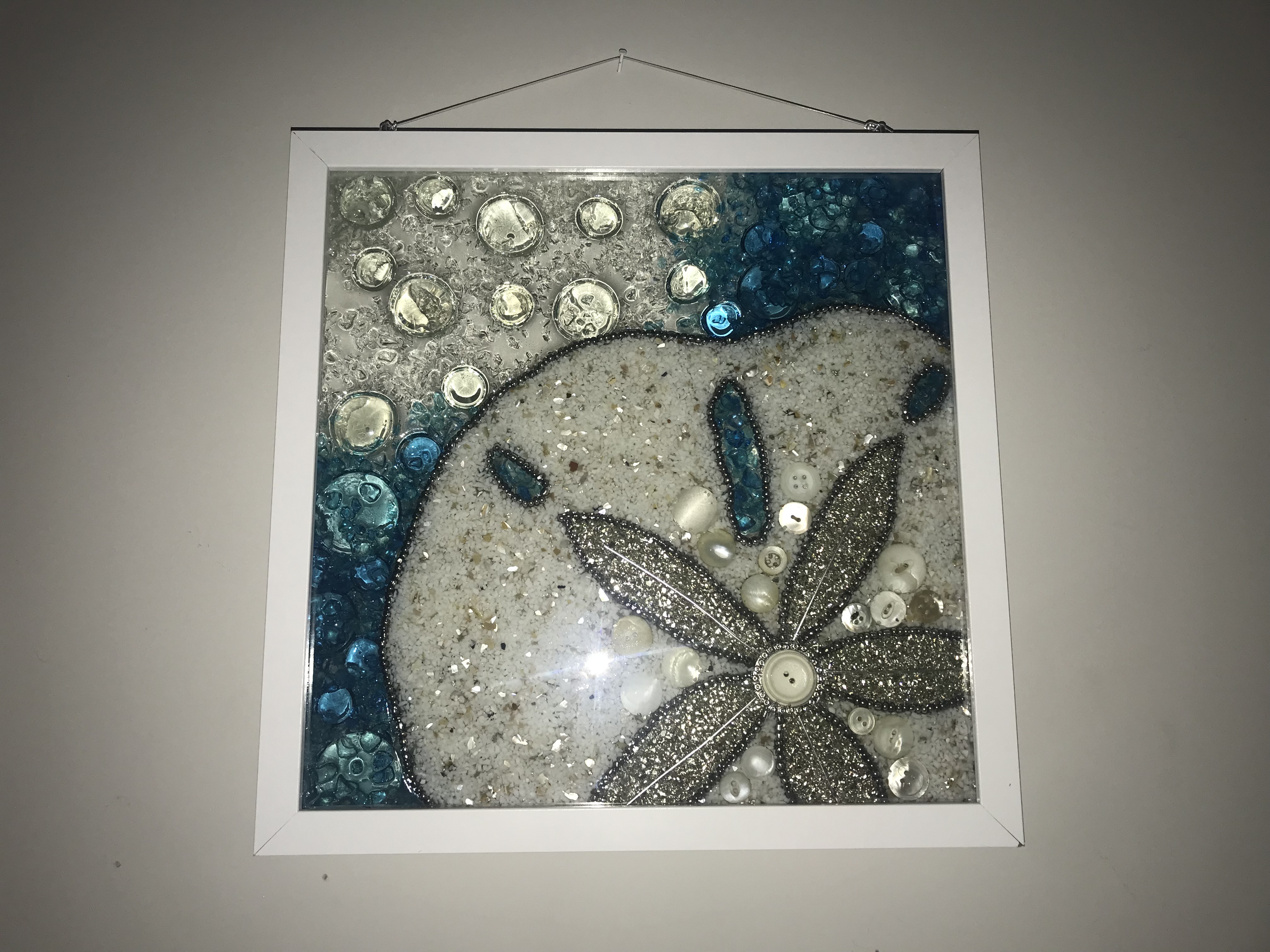 She had several what looked like stained glass hanging in the window. It actually ended up being pieces made out of resin with sand and buttons making the design. The artist was out of Wilmington, Doodad Mosaics by Autumn Wilkins. I bought the sand dollar piece.